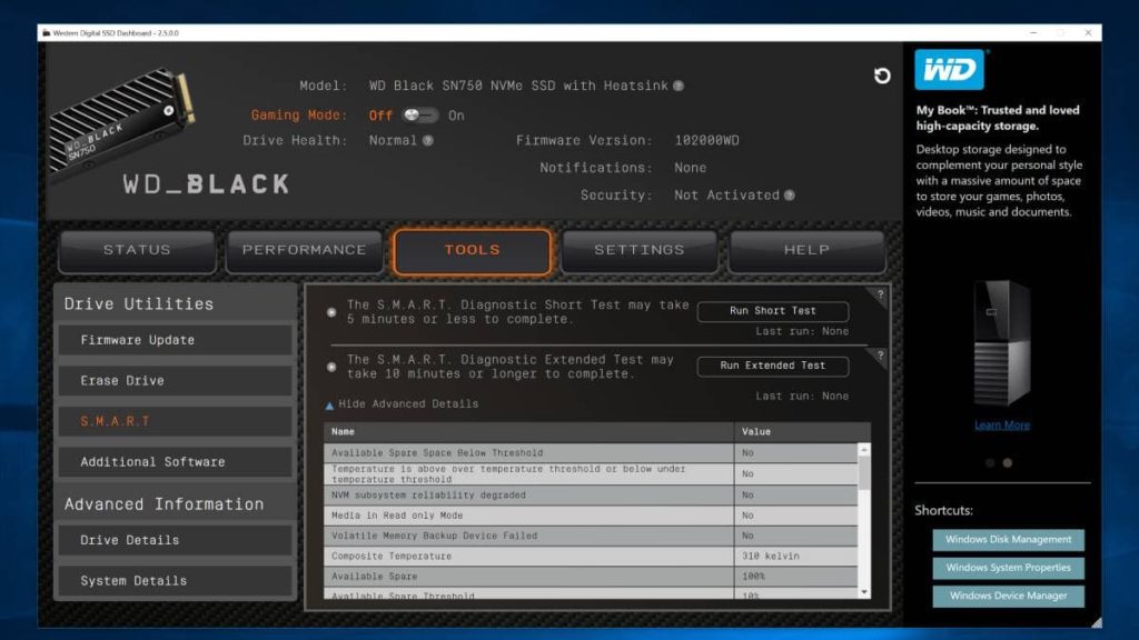 Western Digital accompanied the launch of the Black SN750 is a new Dashboard software. The software is compatible with drives using Sandisk’s controller. When it detects a WD Black drive, is makes the “Game Mode” option available.