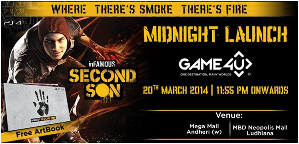 Game4u, India’s leading video games retail arm has announced that it will host the midnight launch of Second Son on the 20th of March, 2014. The midnight launch events will begin at 11:55 pm at the following locations: