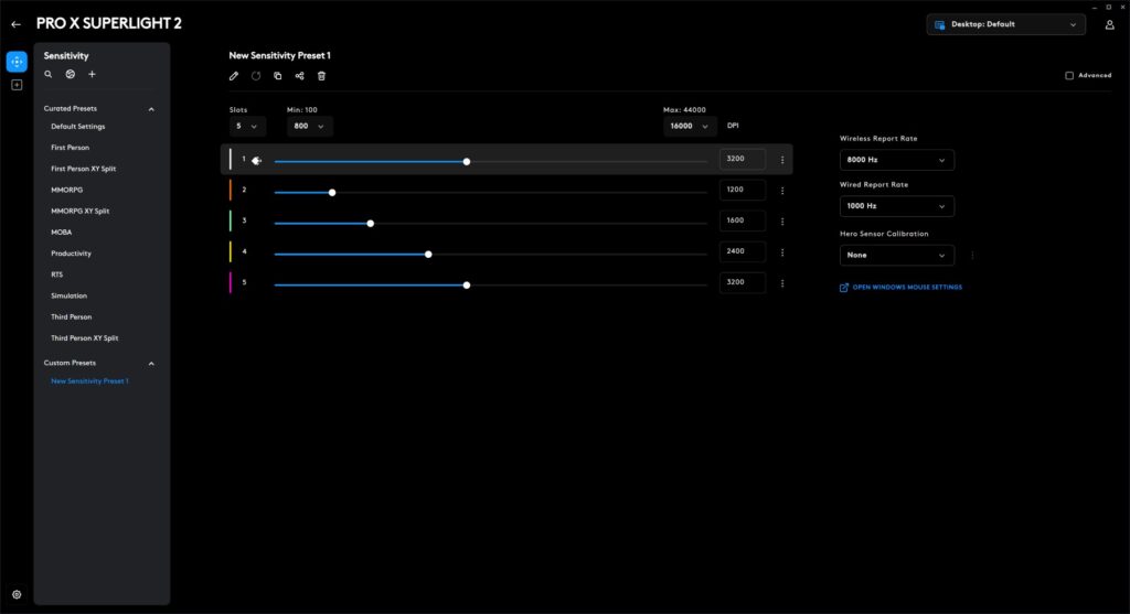 Logitech G Hub, the software used to customize the Superlight 2, offers a decent level of control over the mouse’s settings. You can adjust DPI, polling rate, button assignments, and create custom profiles for different games or applications. The software is generally user-friendly, but it can be a bit overwhelming for those new to it. There are presets like MMORPG, MOBA, RTS, Productivity. You can have different sensitivity for both the X-Axis and Y-Axis. This is needed especially for ultrawide setups. The mouse’s onboard memory supports up to five profiles, allowing users to store different configurations for various games.