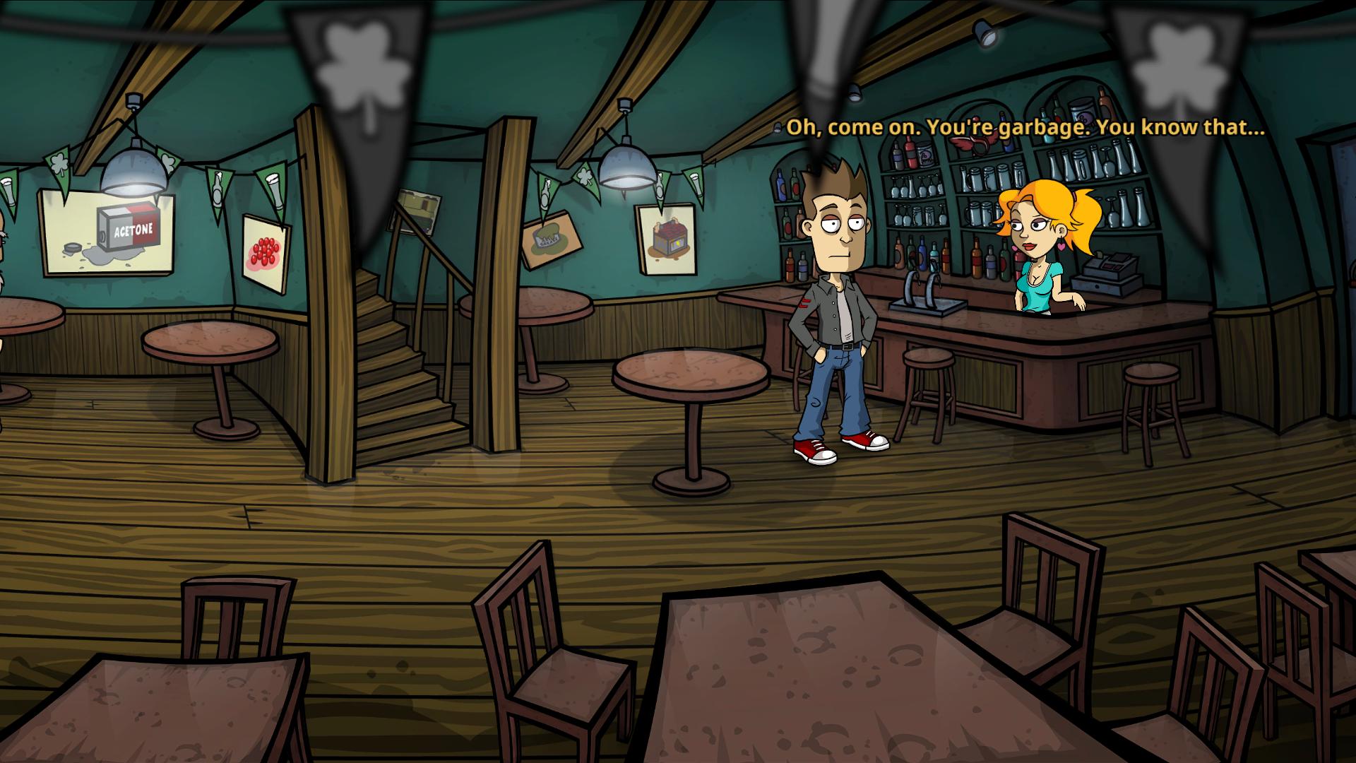 The game is fully voiced and the voice acting is well done. The game’s cartoony vibe is conveyed aptly in the narration and the kookiness of the dialogue which is funny for the most part, with much dark humor and situational jokes. It was wonderful to see how the dialogue between Randal and the bartender changed and by the end almost reversed roles as the game progressed and her looks changed. The music is minimalistic and apart from the main theme, unnoticeable. However, the short loopy tracks are apt for the dialogue heavy game as the voice action is always very clear and audible.
