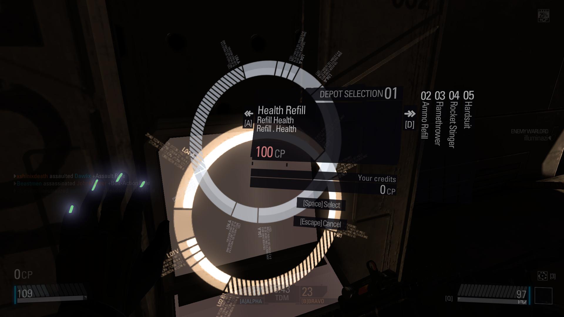 You get match points for performing objective based actions throughout the entire match, enabling purchase of items from depots scattered around the map. The set of items you take is customizable; meaning you can tailor your items to compliment your playstyle. For instance you can get ammo refills or flamethrowers for cheap or save up for a rocket launcher or a katana, while your most expensive one is a hardsuit. The hardsuit can completely change the game, since it gives a team a mobile heavy weapons. It can be countered through flamethrowers or rocket launchers. Just be careful while you request for a hardsuit drop as it takes time to spawn and if you are shot during it you lose the item and the points. Matches generally end with several hardsuit’s on the field at once and the chaos is amazing.