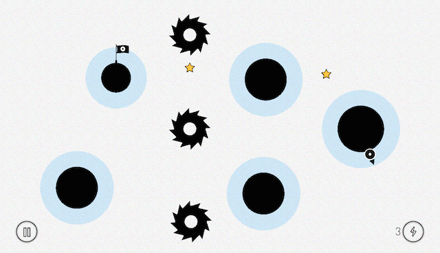 Like your Windows XP Labyrinth game, the latest genius Rayman: Legends or the Indie Classic Supermeat Boy, you will control the central character, which is but a black dot, and together cruise towards the finish flag. Between the starting point and the flag are some insane drops (not the Dubstep kinds), spikey things, and a great deal of rotational pull. The ball needs to leap from one big dot to another, sticking to its tangent, and then needs to make a dash for the next. Fixating on the overall swing of the bigger dot you are homing, you will need to adjust your next leap of faith, thereby not only making sure that you clutch onto the next dot but also collecting stars that will rate your results. Get all the three stars in the levels to unlock the next chapter.